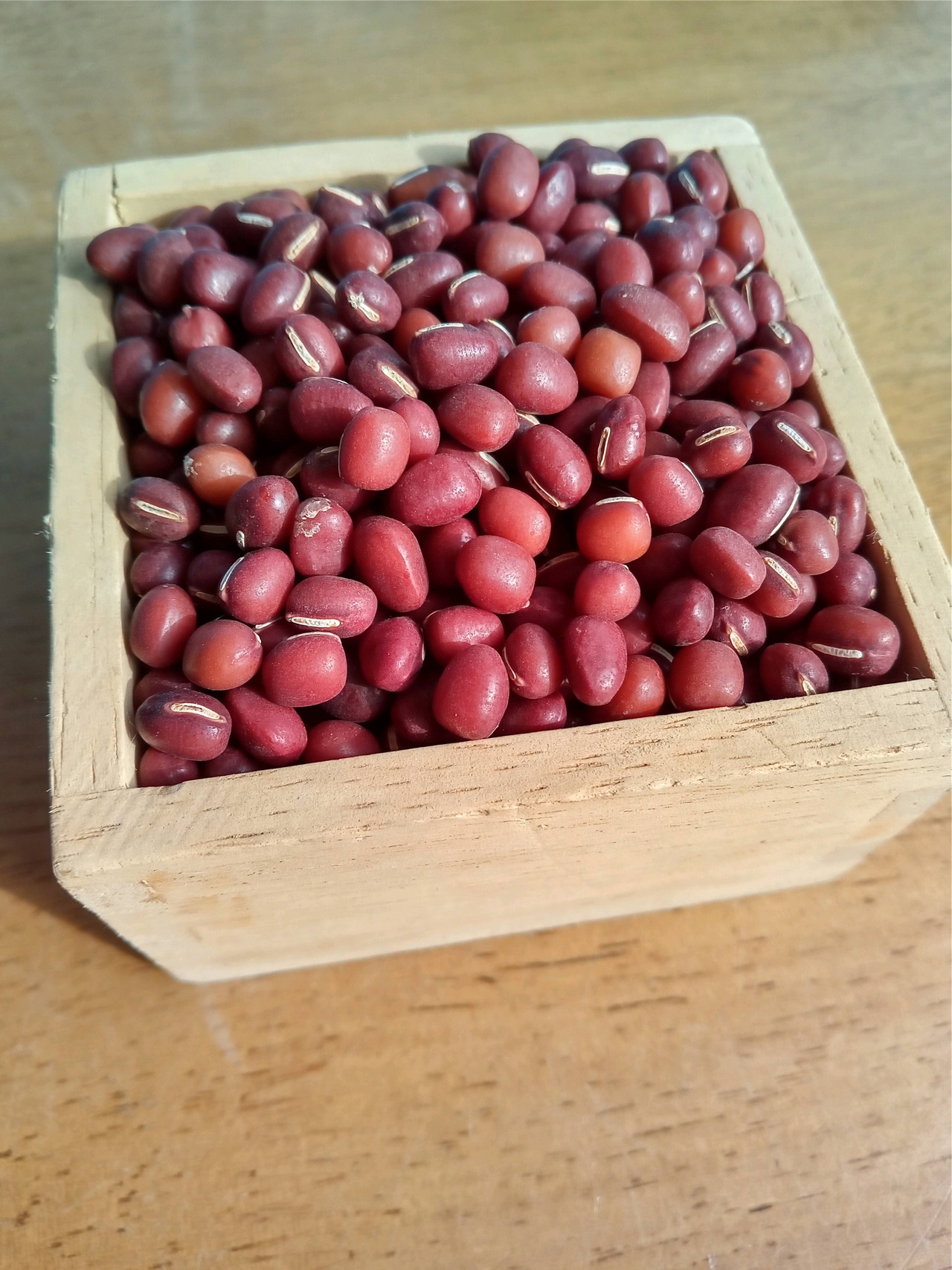 土づくりに励んだ農地の滋養と太陽の恵みをたっぷりと吸収し、人間の手で草の陰にならないように除草して、秋に日が短くなり枝葉が茶色くなって豆が完熟してから草刈り機で刈り取り収穫し、畑にてニオ積みして自然乾燥、雪が積もる前にやっと脱穀して、冬の間、人の手を目でひとつひとつ選別した、まさに手間暇惜しまず手塩にかけて育てた小豆です。